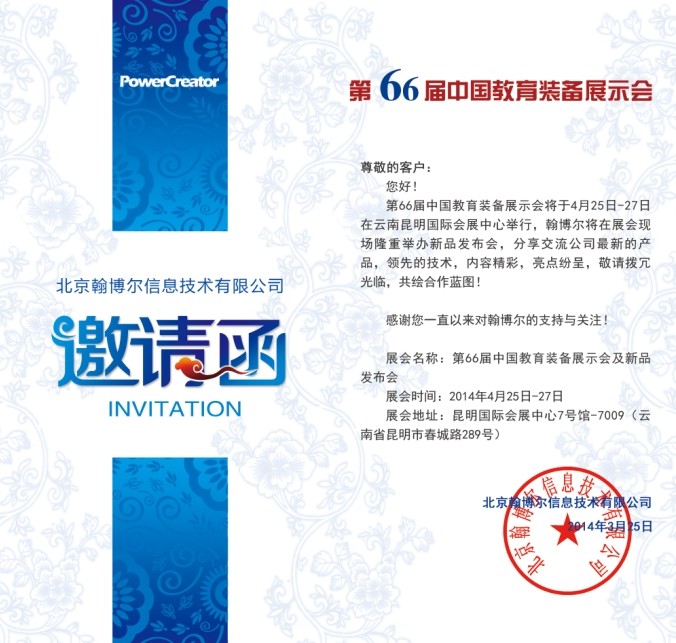 屆時,讓我們相聚昆明,共敘友情,交流展示,合作創(chuàng)新,相信翰博爾出眾的產(chǎn)品、精彩的講解、周到的服務(wù),定會讓您青睞有加,信心倍增。讓我們共同攜手,為促進(jìn)教育事業(yè)科學(xué)發(fā)展、加快教育現(xiàn)代化進(jìn)程做出更多的貢獻(xiàn)。