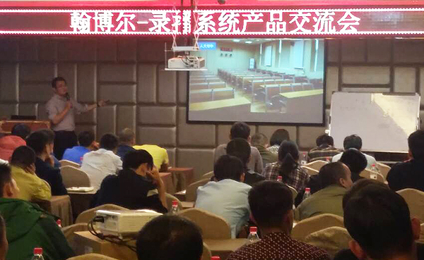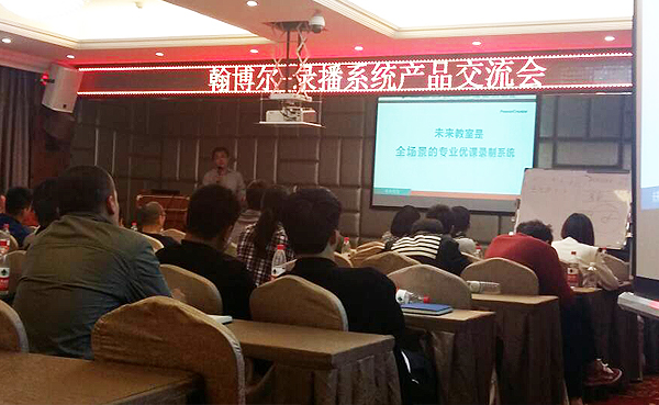 產品交流會上,翰博爾工作人員向來賓講解了未來教室、專業錄播教室和云錄播教室的建設方案和資源應用,獲得來賓的極大關注。現場互動頻繁,來賓積極了解產品的各項功能。