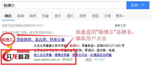 作為錄播引領者,翰博爾在業內的知名度、影響力毋庸置疑,然而卻有小部分企業惡意盜用翰博爾的品牌知名度,利用百度搜索引擎的漏洞,假冒“翰博爾”之名騙取用戶點擊,獲取用戶信息,甚至對用戶造成嚴重財產損失。