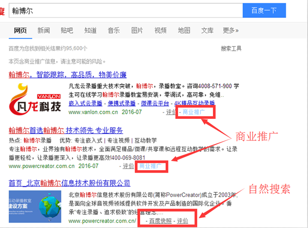 ①百度調整搜索引擎策略,搜索結果包括付費顯示和自然搜索排名兩大類。付費推廣鏈接均帶有藍色“商業推廣”字樣,排名比自然搜索靠前,也與客戶搜索的目標貼合度更高。無良商家正是通過這一方式惡意盜用翰博爾品牌,讓客戶掉入廣告陷阱。