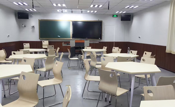 在錄播教室環境設計上,從教室頂棚、墻壁、窗簾、地面、門、燈光照明、講臺做全面的裝修,可以更好的配合錄播系統進行精品課程的錄制。頂棚吊天花板,采用具有吸音效果的礦棉吊頂吸音板。窗簾用米黃色厚棉遮光布,墻壁采用優質吸音棉進行包裝,乳膠白的墻面裝修用料顏色淺、無反光。考慮到現代教學方式的不斷創新,課堂桌椅特意設置成六角形狀,教師可以根據授課需要隨時調整教學場景。