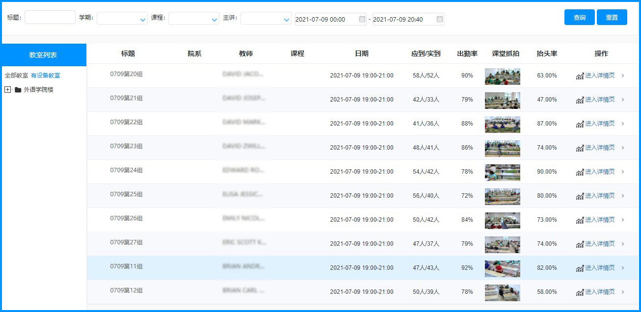 在7月9日晚19時-21時的分組集中學習討論環節,學院共安排16號樓27間教室并分別進行錄制和考勤統計工作。這些教室里配備了翰博爾AI高清攝像機、多功能教學系統、屏幕采集系統、全方位采音設備,建設成本低,部署迅速。另外,翰博爾無感知AI考勤系統,多維度學情分析等為這套常態化錄播應用錦上添花,并在集中學習討論的27間教室內將“快、準、穩”發揮到極致。