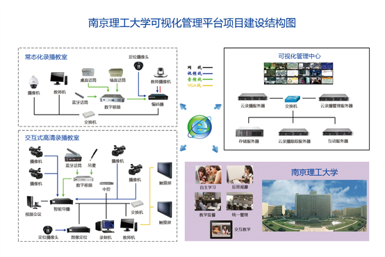 為學校建設智能化教學環境,通過翰博爾云錄播系統,對南京理工大學90間常態化錄播教室、2間交互式高清全自動錄播教室以及可視化教學管理中心進行統一管理,實現教學錄制觀摩、教學監控、資源管理的目標。